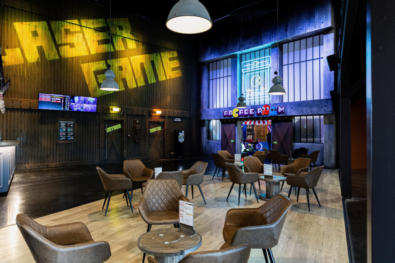Création d’un mur d’isolement d’une salle d’arcade, construction bois, verrières polyuréthanes, fausses portes, effets béton. Hauteur 8m