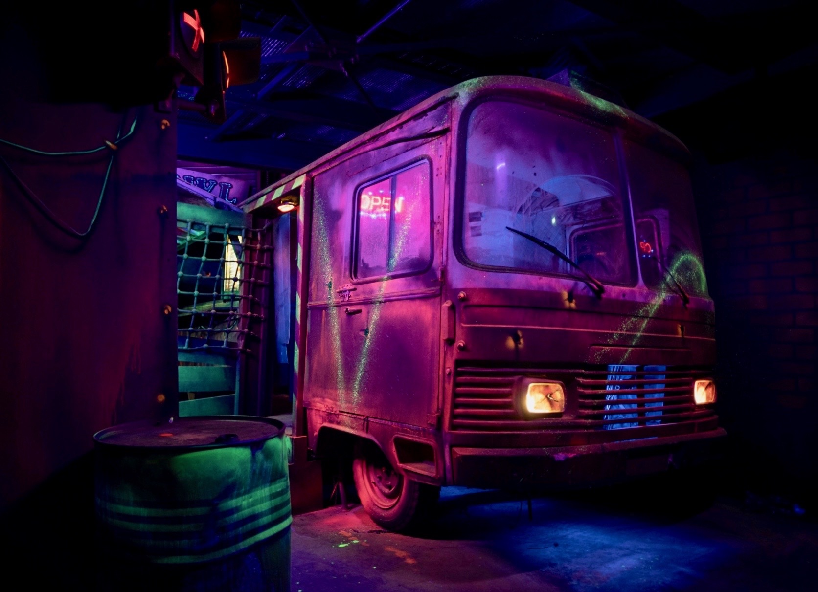 Modification d’un vieux camion, création zones dans le labyrinthe de jeu, disposition d’éléments 3D comme des tôles, palans, futs, signalétiques etc