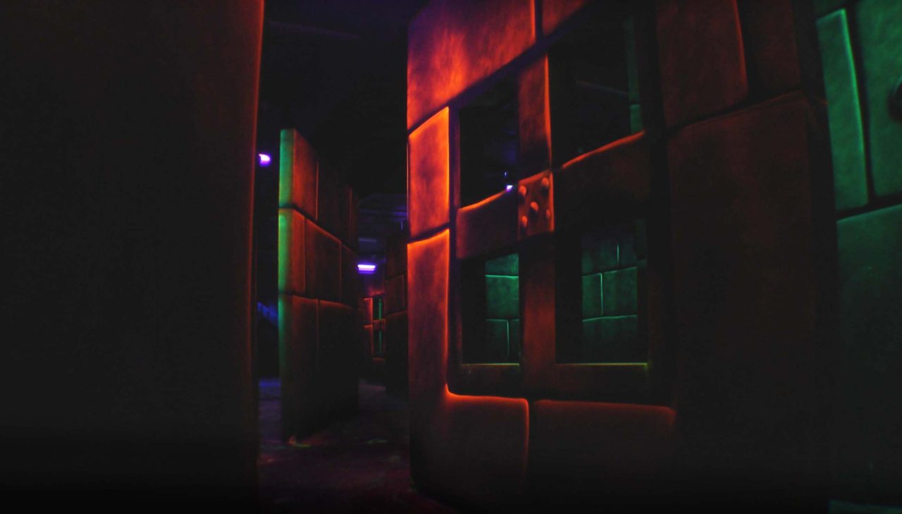 Création de fresques fluorescentes peintes dans des espaces de jeu de laser games. Thème forteresses, chateaux forts. Techniques mixtes.