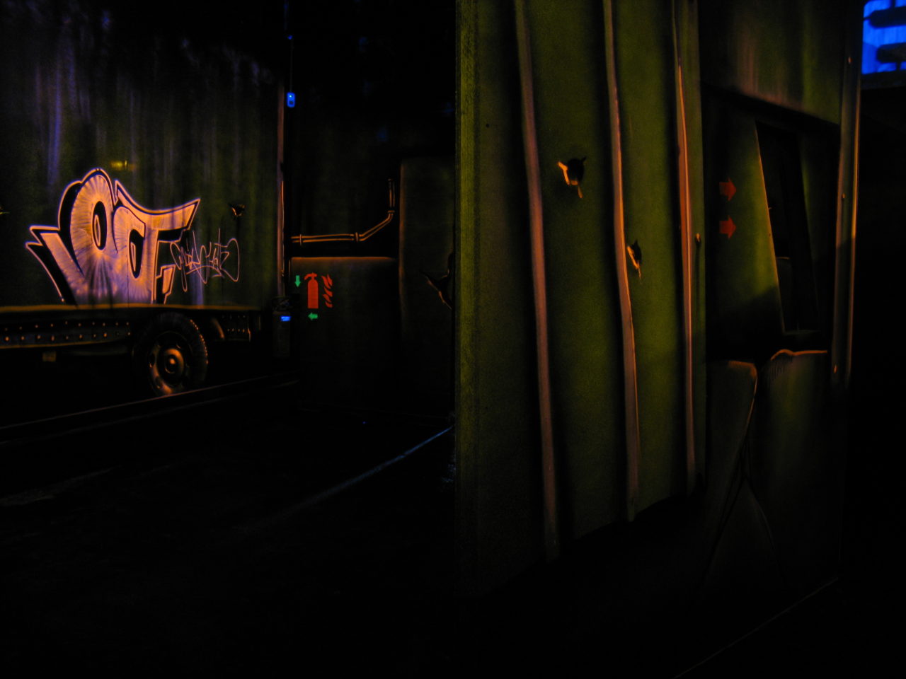 Fresques peintes dans les arènes de jeu de laser games, thème urbain, ville détruite et post apocalypse… Réalisation en peinture fluorescentes, techniques mixtes.