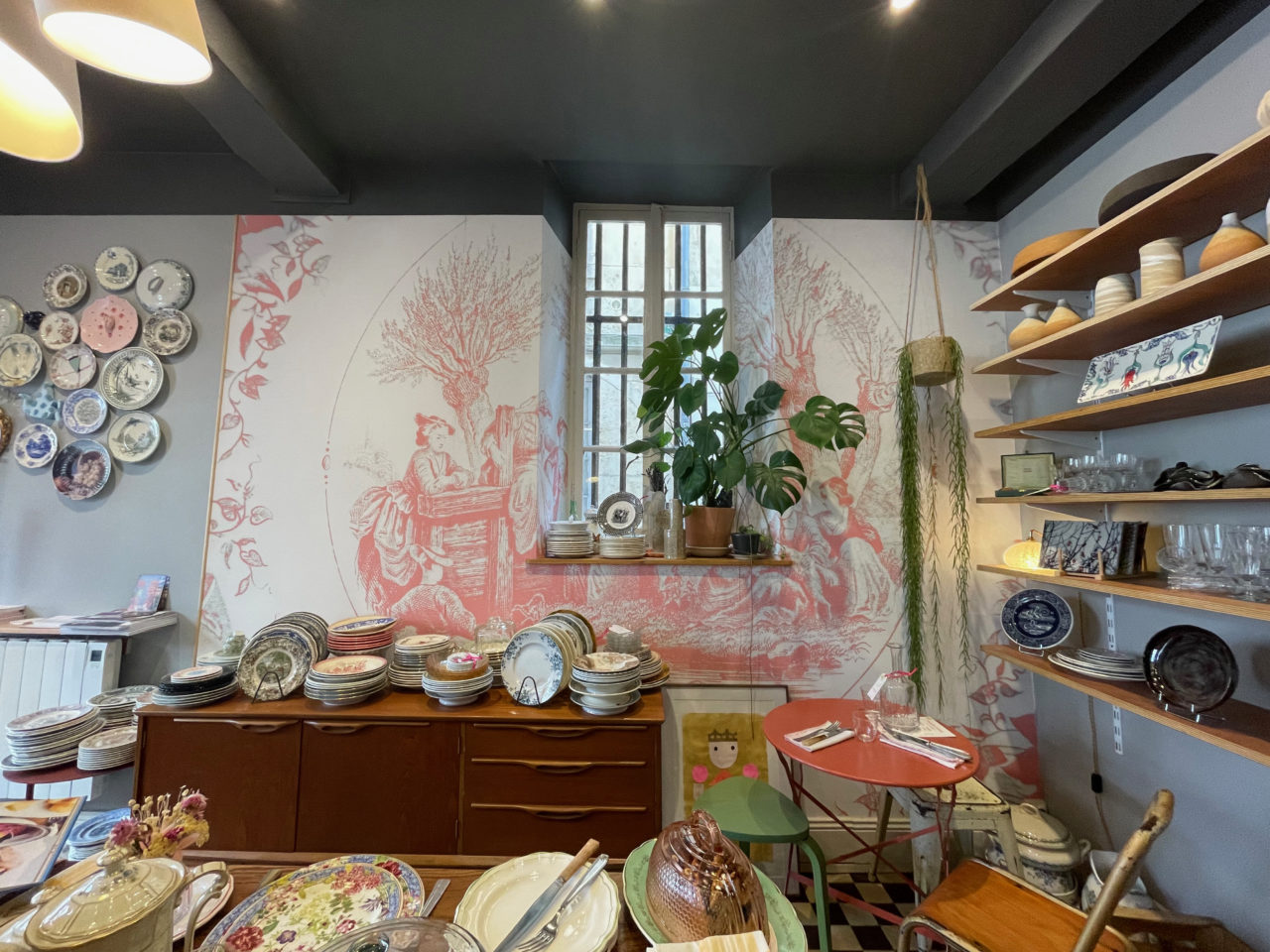 Design complet d’une boutique de vente de vaisselle ancienne, créations céramiques contemporaines et restauration.