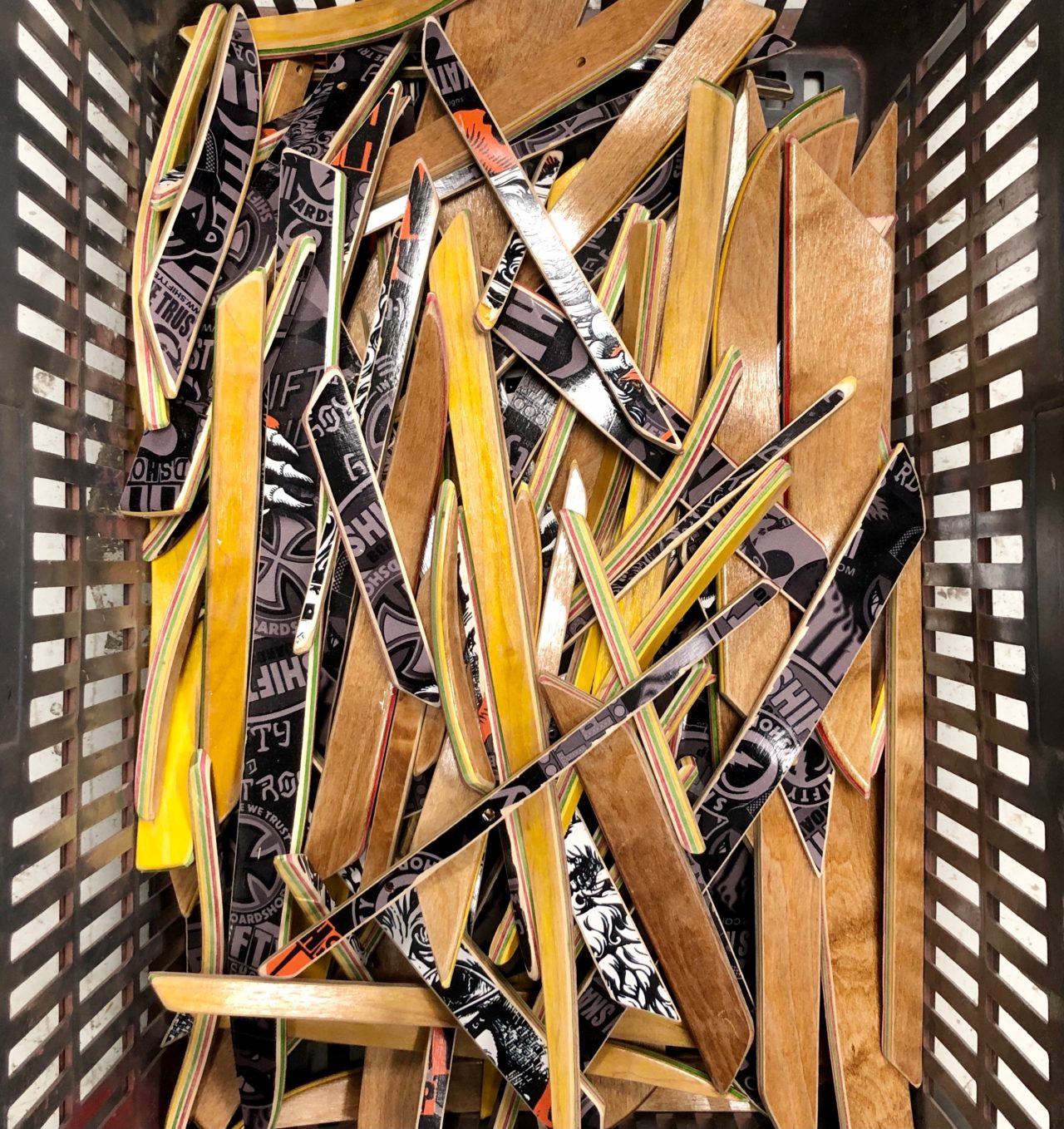 Découpe de 9 planches de skate sérigraphiées Shifty et création d’une sculpture « arbre » afin de donner une seconde vie à un olivier + cabane à oiseau